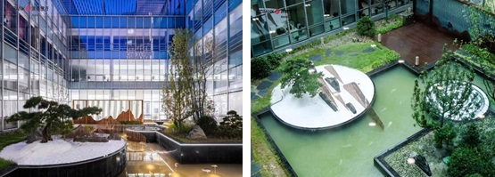 中心庭院優(yōu)化了采光和通風(fēng)效果,同時(shí)為使用者營造休憩、交流的場所;裙樓屋頂花園與中心庭院相互對景相互滲透,加強(qiáng)了空間的連續(xù)性與共享性。作為湖東金融區(qū)的東大門,塔樓引入“垂直園林”的理念,在東側(cè)每隔三層設(shè)置一個(gè)空中花園,讓小橋流水的悠閑與愜意融入到現(xiàn)代化辦公場所中。塔樓外立面采用全幕墻形式,幕墻系統(tǒng)光影效果豐富,同時(shí)具有很好的遮陽效果。