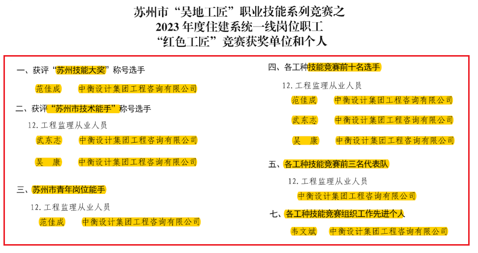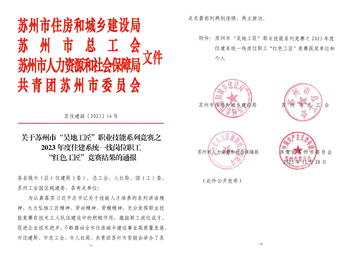 11月28 日,蘇州市住建局、市總工會(huì)、市人社局及共青團(tuán)蘇州市委聯(lián)合發(fā)文,對(duì)蘇州市“吳地工匠“職業(yè)技能系列競(jìng)賽之2023 年度住建系統(tǒng)一線崗位職工“紅色工匠”競(jìng)賽結(jié)果進(jìn)行通報(bào)。